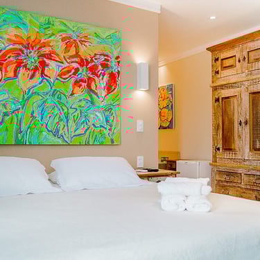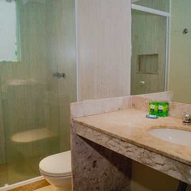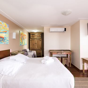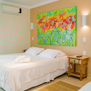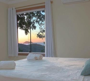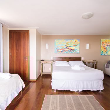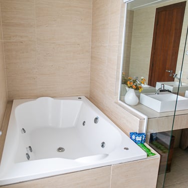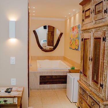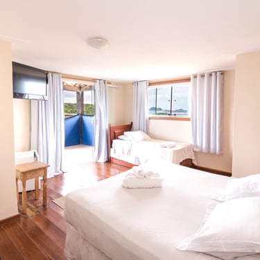 A suíte master com vista para o mar e banheira de hidromassagem dupla é o refúgio perfeito para quem busca uma experiência de hospedagem única e memorável.